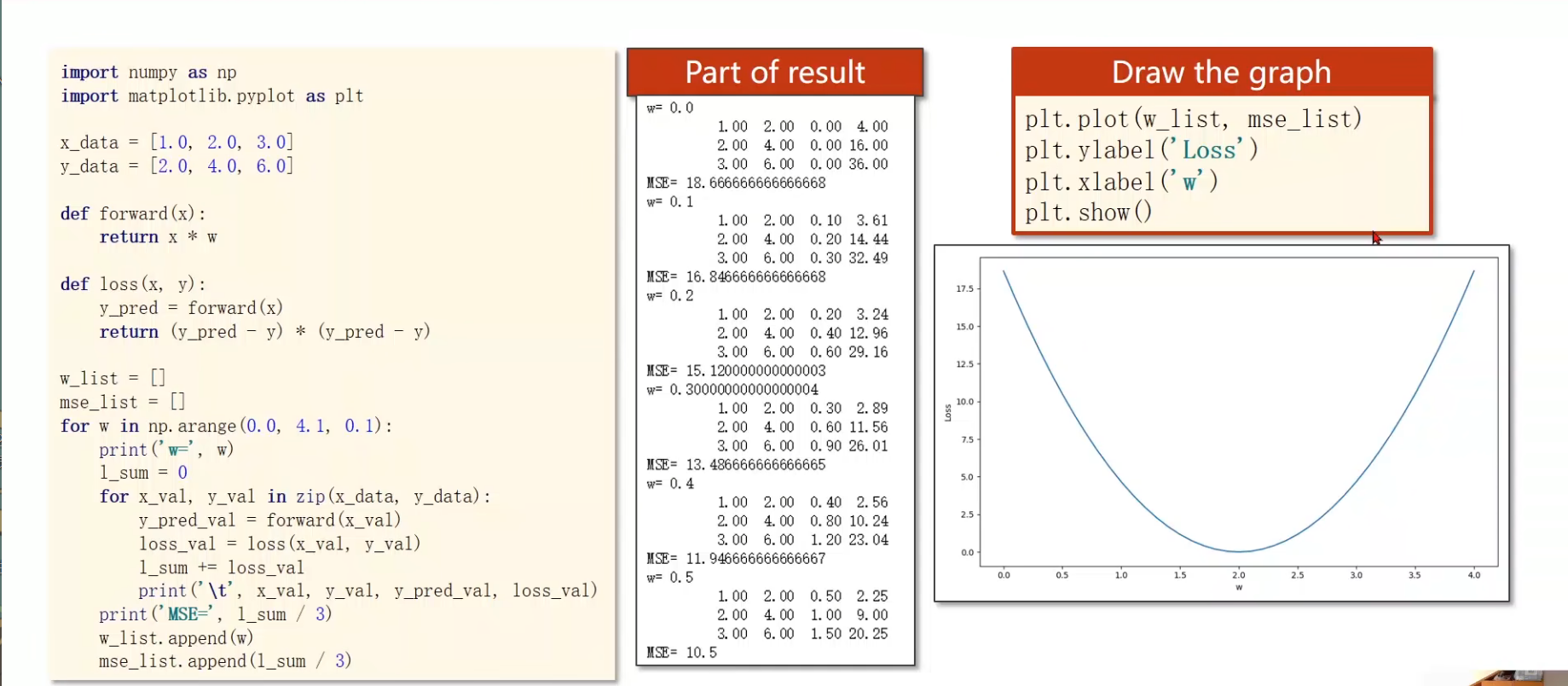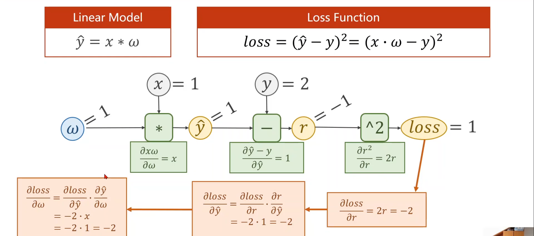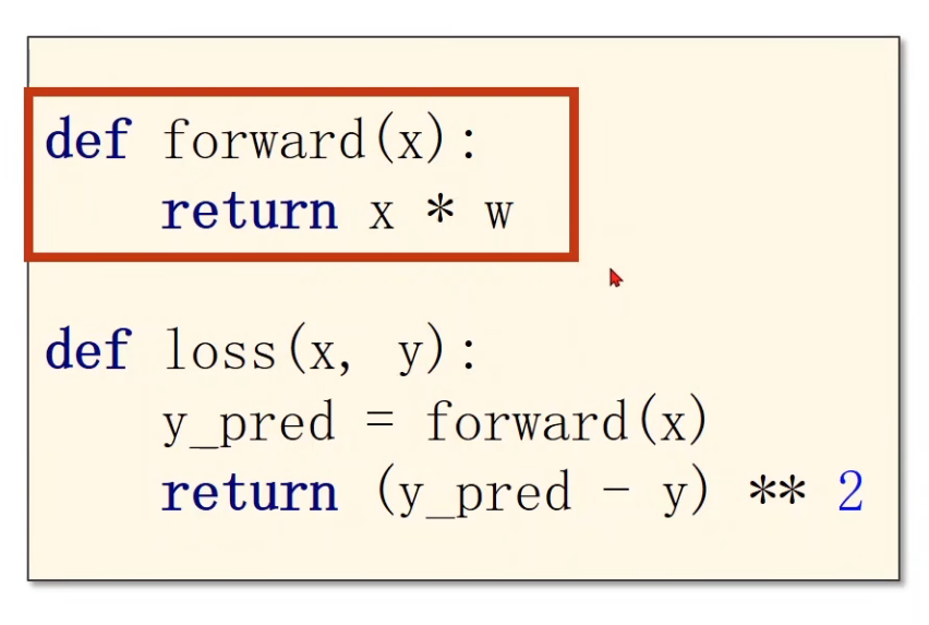 Define the loss funciton: l o s s = ( y h a t − y ) 2 = ( x ∗ w − y ) 2 loss = (y_{hat} - y)^2 = (x * w - y)^2 l oss = ( y ha t − y ) 2 = ( x ∗ w − y ) 2 .