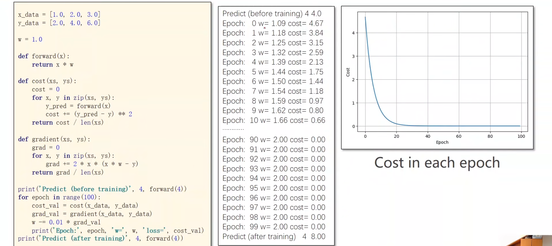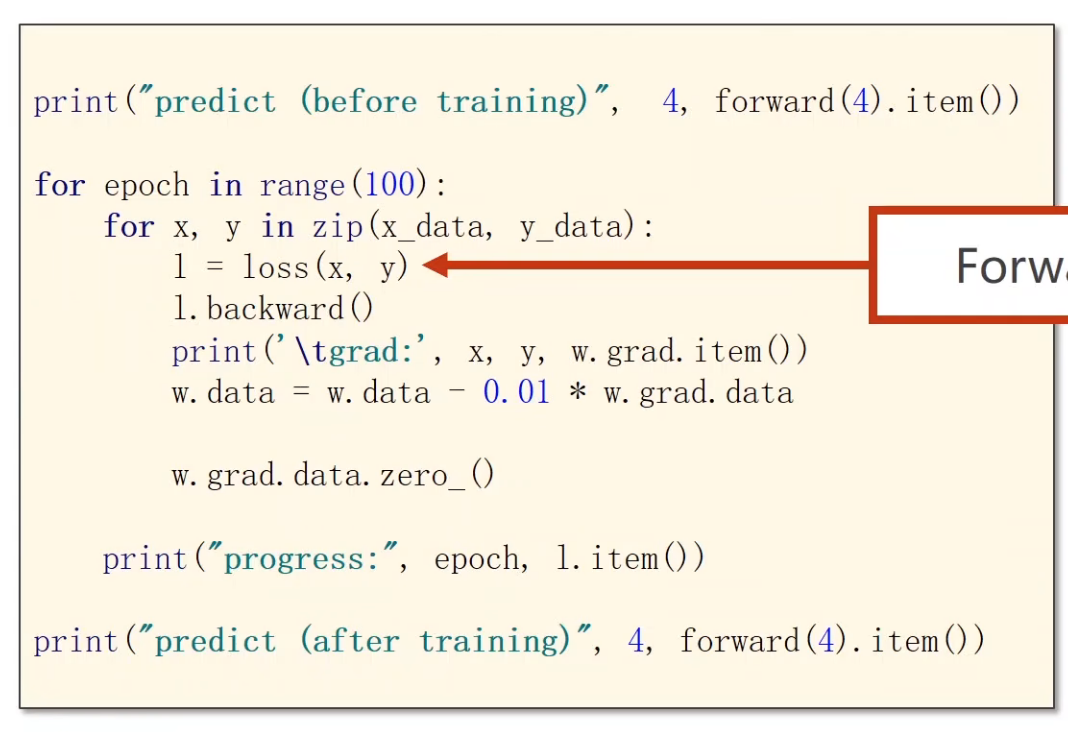 1 2 3 4 5 6 7 8 9 10 11 12 13 14 15 16 17 18 19 20 21 22 23 24 25 26 27 28 29 30 31 32 33 34 35 36 37 38 39 import torchx_data = torch.Tensor([[1.0 ],[2.0 ],[3.0 ]]) y_data = torch.Tensor([[2.0 ],[4.0 ],[6.0 ]]) class LinearModel (torch.nn.Module): def __init__ (self ): super (LinearModel,self ).__init__() self .linear = torch.nn.Linear(1 ,1 ) def forward (self,x ): y_pred = self .linear(x) return y_pred model = LinearModel() criterion = torch.nn.MSELoss(size_average=False ,reduce=True ) optimizer = torch.optim.SGD(model.parameters(),lr=0.01 ) for epoch in range (1000 ): y_pred = model(x_data) loss = criterion(y_pred,y_data) print (epoch,loss.item()) optimizer.zero_grad() loss.backward() optimizer.step() print ('w = ' ,model.linear.weight.item())print ('b = ' ,model.linear.bias.item())x_test = torch.Tensor([[4.0 ]]) y_test = model(x_test) print ('y_pred = ' ,y_test.data)