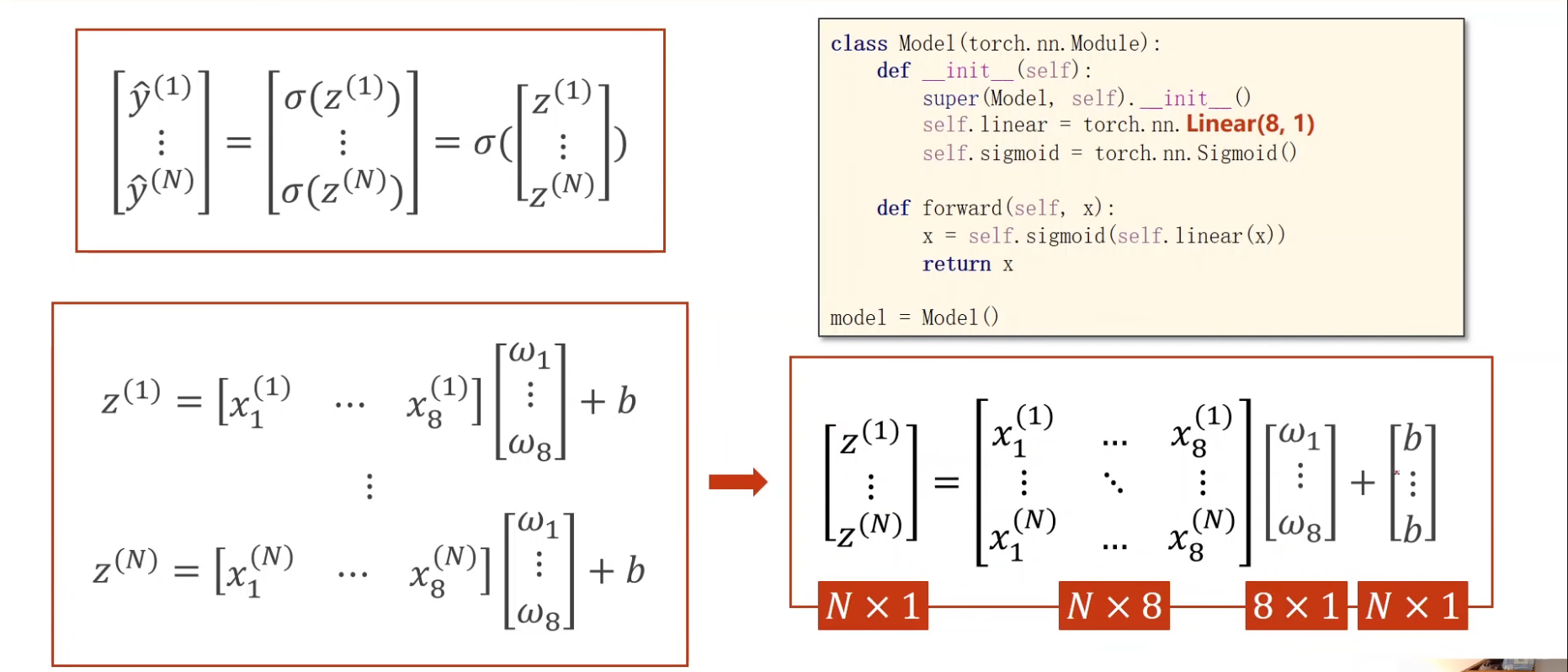 1 2 3 4 5 6 7 8 9 10 11 12 class Model (torch.nn.Module): def __init__ (self ): super (Model.self ).__init__() self .linear1 = torch.nn.Linear(8 ,6 ) self .linear2 = torch.nn.Linear(6 ,2 ) self .linear3 = torch.nn.Linear(2 ,1 ) self .sigmoid= torch.nn.Sigmoid() def forward (self,x ): x = self .sigmoid(self .linear1(x)) x = self .sigmoid(self .linear2(x)) x = self .sigmoid(self .linear3(x))