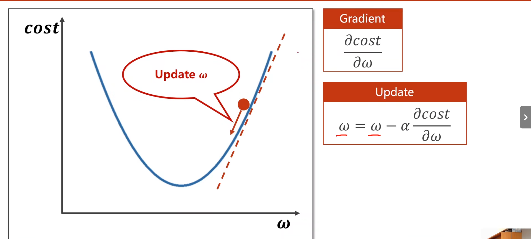 Do the update:ω = ω − α ∂ c o s t ∂ ω \omega = \omega - \alpha\frac{\partial cost}{\partial \omega}