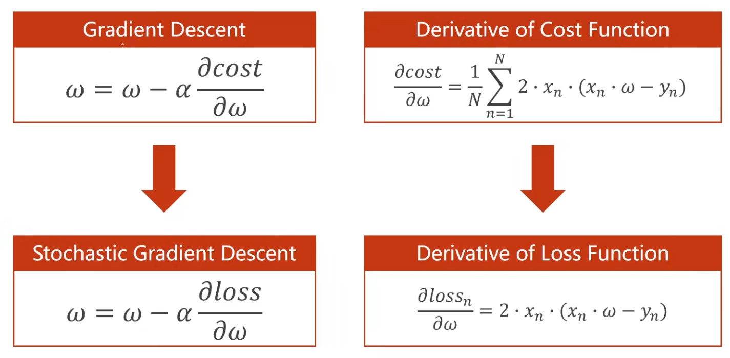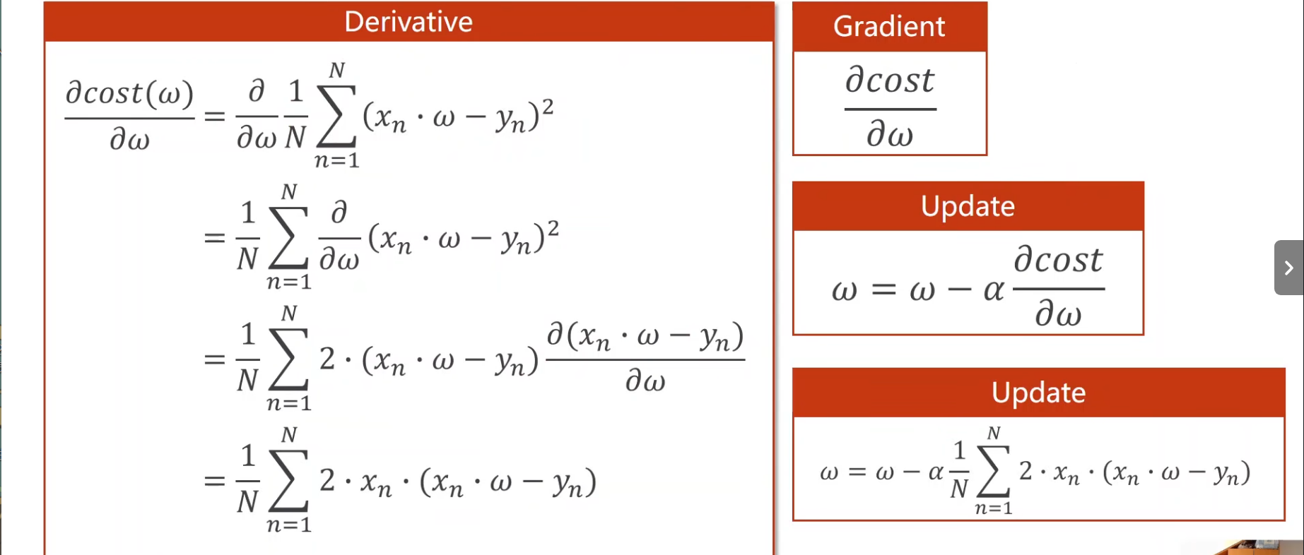 Define the gardient function:∂ c o s t ∂ ω = 1 N ∑ n = 1 N 2 ⋅ x n ⋅ ( x n ⋅ ω − y n ) \frac{\partial cost}{\partial \omega} = \frac{1}{N} \sum_{n=1}^{N} 2 \cdot x_n \cdot (x_n \cdot \omega - y_n)